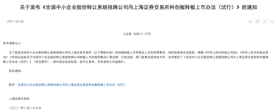 2月26日,上海证券交易所(下称“上交所”)发布《全国中小企业股份转让系统挂牌公司向上海证券交易所科创板转板上市办法(试行)》(下称《转板上市办法》)。这是继2020年11月27日发布征求意见稿后,《转板上市办法》的正式推出并实施。